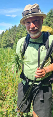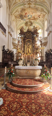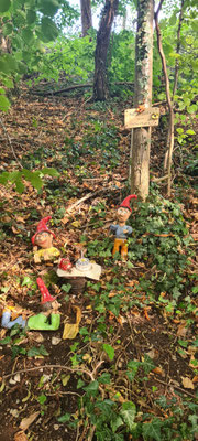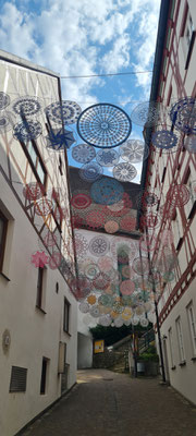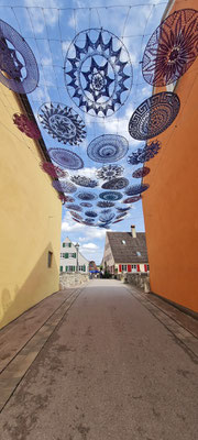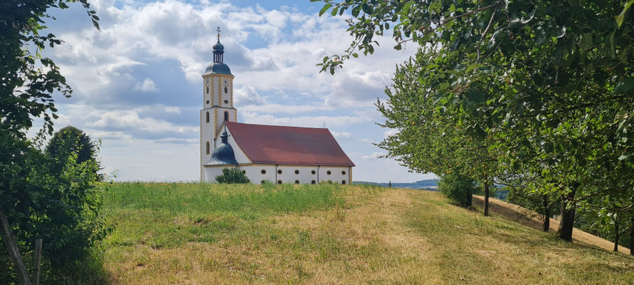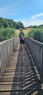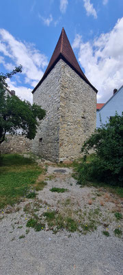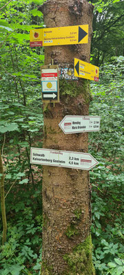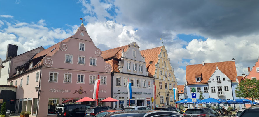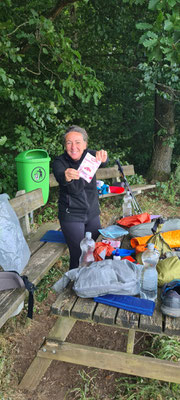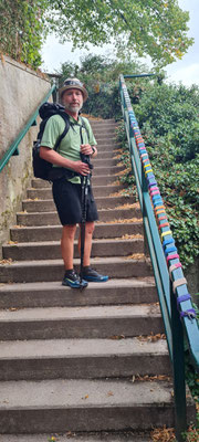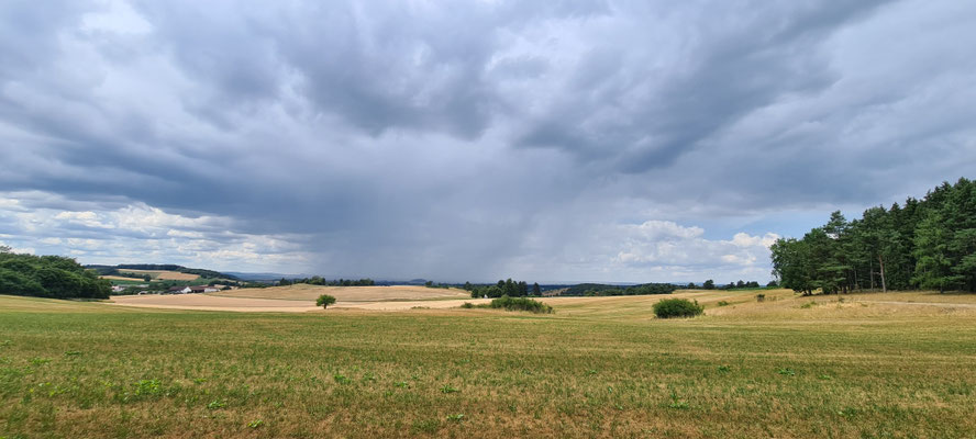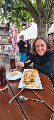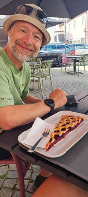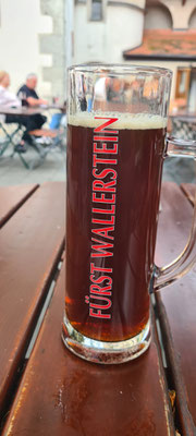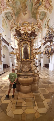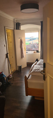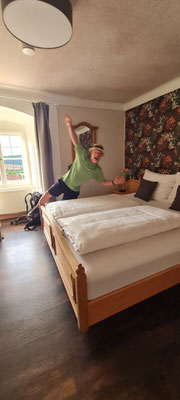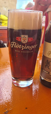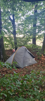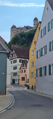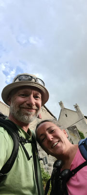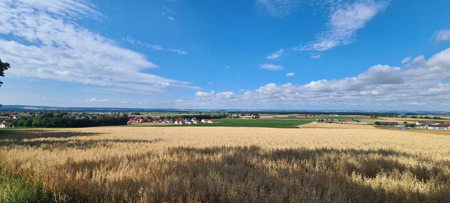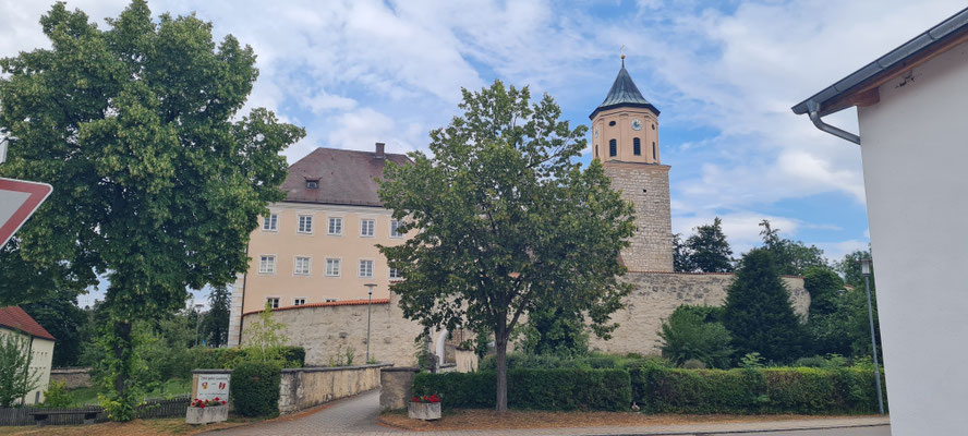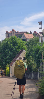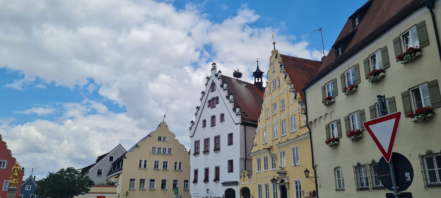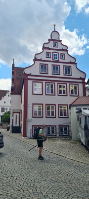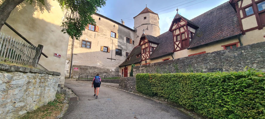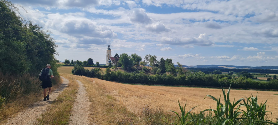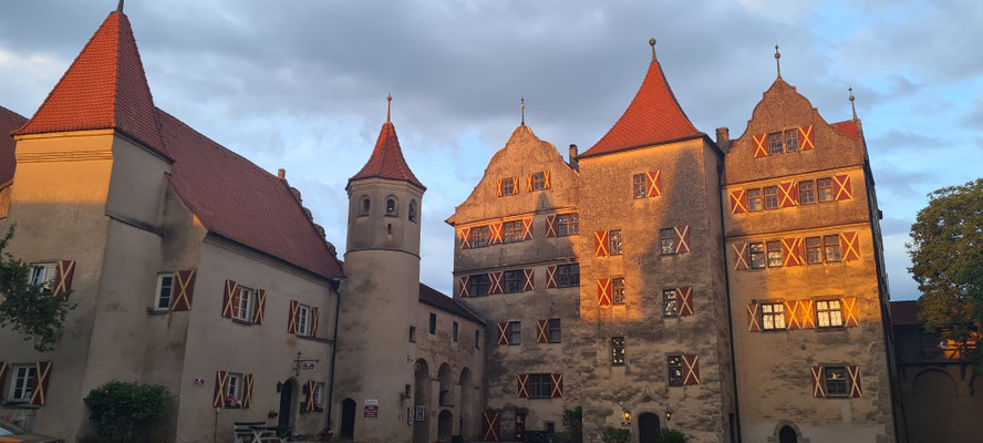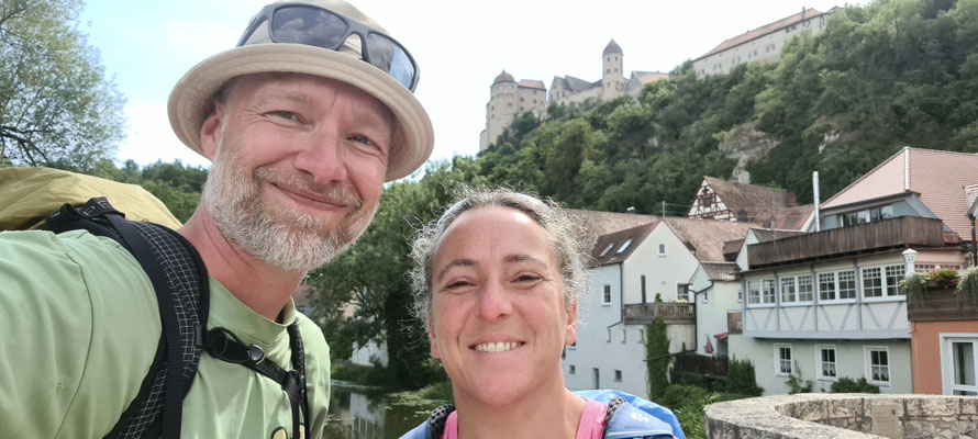 Auch im Zelt mitten im Wald kann man ausschlafen, wir wachen tatsächlich erst um 7:30 auf. Die Nacht war sehr ruhig, trotz regem Fledermausverkehr. Und wenn es schon mal so spät ist, plus der letzte Tag, essen wir gemütlich unserer letztes Bircher-Himbeermüsli mit doppelter Portion löslichem Kaffee. Unsere Gaskartusche reicht perfekt um 1L Wasser hierfür warm zu machen. Das beste ist, wir haben einen eigenen Mülleimer! Manchmal ist man auch mit wenig zufrieden. Gesättigt und mit Start-Koffein geht es auf die letzten 28km bis Harburg. Meine letzte Blase (Jochen) macht leider immer noch Schwierigkeiten - ich bräuchte jetzt mal einen Tag Pause - aber da es der letzte Tag ist..... müssen die Füße durchhalten. Erstes Zwischenziel ist Wemdingen, die Maria mit dem Wendeblick - die Wallfart-Basilika Maria Brünnlein. Die Legende besagt, dass die Marien-Statue mehrmals ihren Blick und Kopf gedreht hat....oder derjenige hat zu viel geraucht. Der Altar wird von einer naheliegenden Quelle mit Wasser gespeist und die Gläubigen können sich das heilende Wasser direkt vom Altar abfüllen. Es gibt auch eine Ablass-Tür...hmmm. im Wemdingen machen wir beim Bäcker einen Stopp für einen zweiten Kaffee. Weiter geht es über den Mähberg - eine anrückende Regenfront lässt uns diesmal schnell die Rucksäcke einpacken. Es regnet zum Glück nur ganz leicht und kurz und wir gehen gemütlich weiter. Das Ende rückt immer näher, eigentlich wollen wir gar nicht ankommen. In Harburg kehren wir im Lamm ein und beschließen auch hier was zu essen. Als es wieder zu regnen beginnt rücken wir zusammen und setzen uns an den Nachbartisch. Wir unterhalten uns so gut das wir fast vergessen weiter zu ziehen. Die letzten Höhenmeter auf die Burg fallen uns leicht. Lustige Wichtel und andere Figuren säumen den Weg. Die Lustige Wirtin nimmt uns herzlich in Empfang und wir beziehen unser Zimmer. Im Burghof lassen wir den letzten Abend ausklingen.